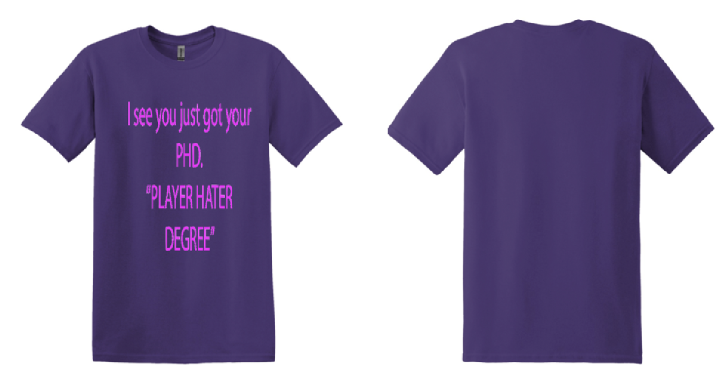 This Tee has a relaxed, fit. Made in the USA, from 100% Cotton. Our garment-dyed, enzyme washed, and buttery soft. An innovative print process keeps ink smooth over time. Your new favorite shirt! Show your love for this Men`s T-Shirt in Magenta and Purple. This fly t-shirt has the words “I see you got your Player Hater Degree” printed graphic on the front with some words that will definitely turn heads on the street. This t-shirt will become your favorite for either daily activities or while just walking to the store.